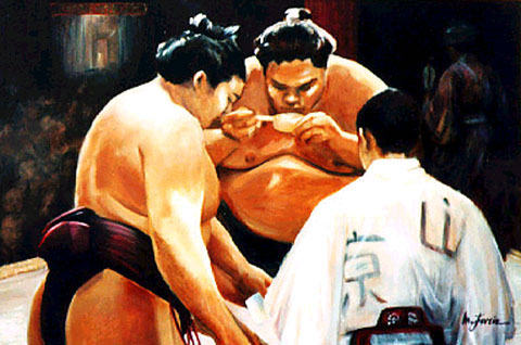 begin, there is a prematch ritual. The sumotori goes to his corner to accept